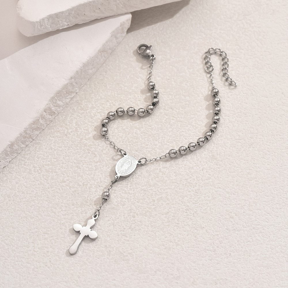 Ezüst Színű Nemesacél (K115) Kereszt Szűz Mária Rózsafüzér Karkötő Hossz: 16,5cm