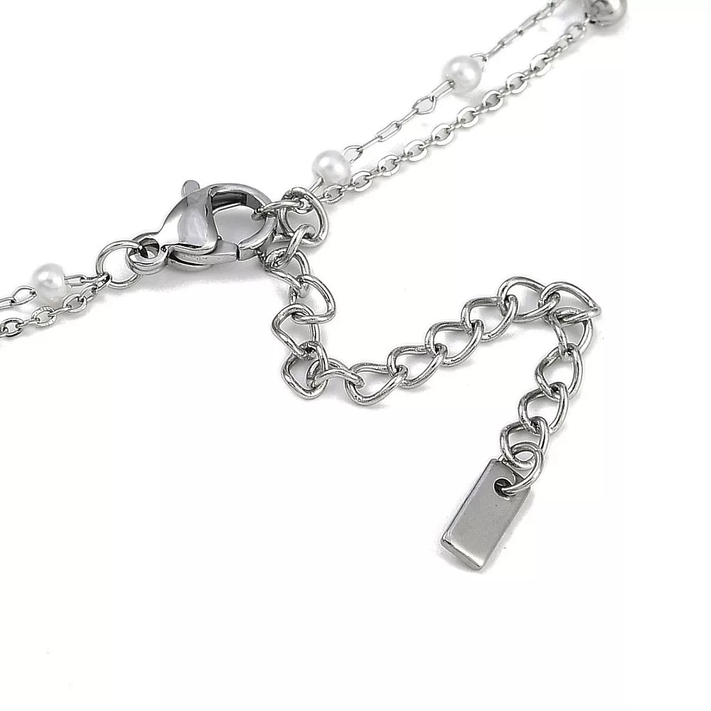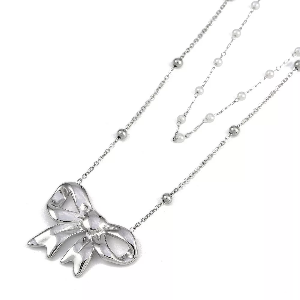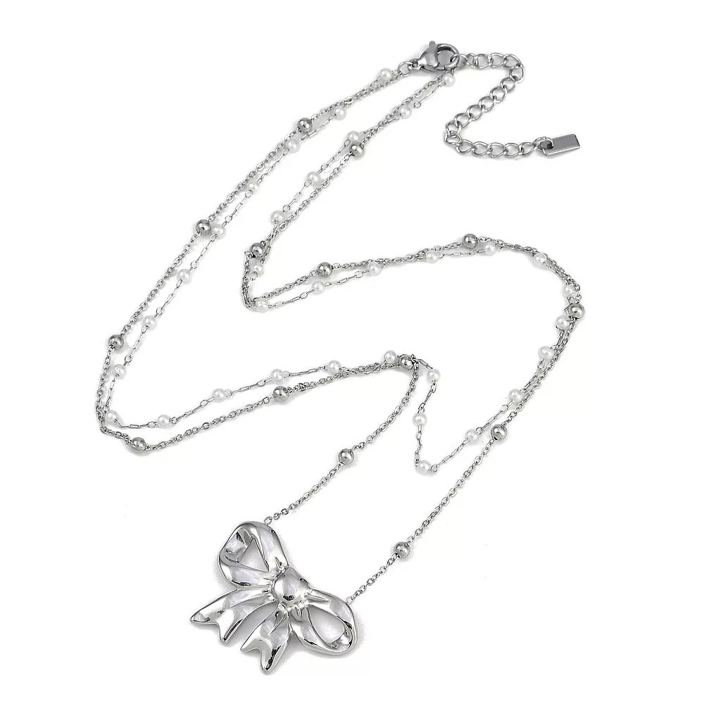 Ezüst Színű Nemesacél Masnis Dupla Nyaklánc Szintetikus Kagyló Gyöngyökkel